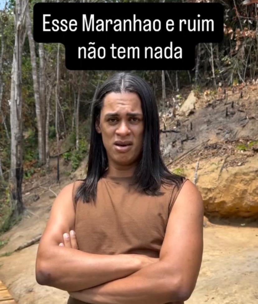 Em seguida, o influenciador mergulha em um rio e destaca as belezas naturais e as riquezas do estado, afirmando que o Maranhão tem muito do que se orgulhar.