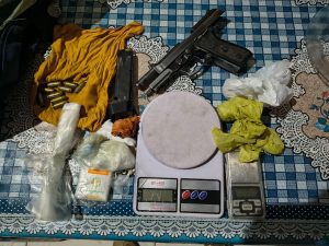 Durante a ação, o suspeito foi encontrado na posse de uma pistola calibre .40, com numeração suprimida, diversas munições e porções de substância entorpecente, além de balança de precisão e materiais utilizados para embalar drogas.