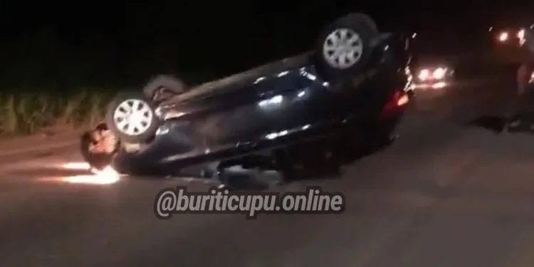 Um acidente aconteceu na noite desta quinta-feira (25) na BR-222, na cidade de Buriticupu. Um carro acabou capotando depois de bater em um boi que estava na estrada. Logo depois, um motociclista que não viu o animal morto na pista bateu nele e caiu na estrada.